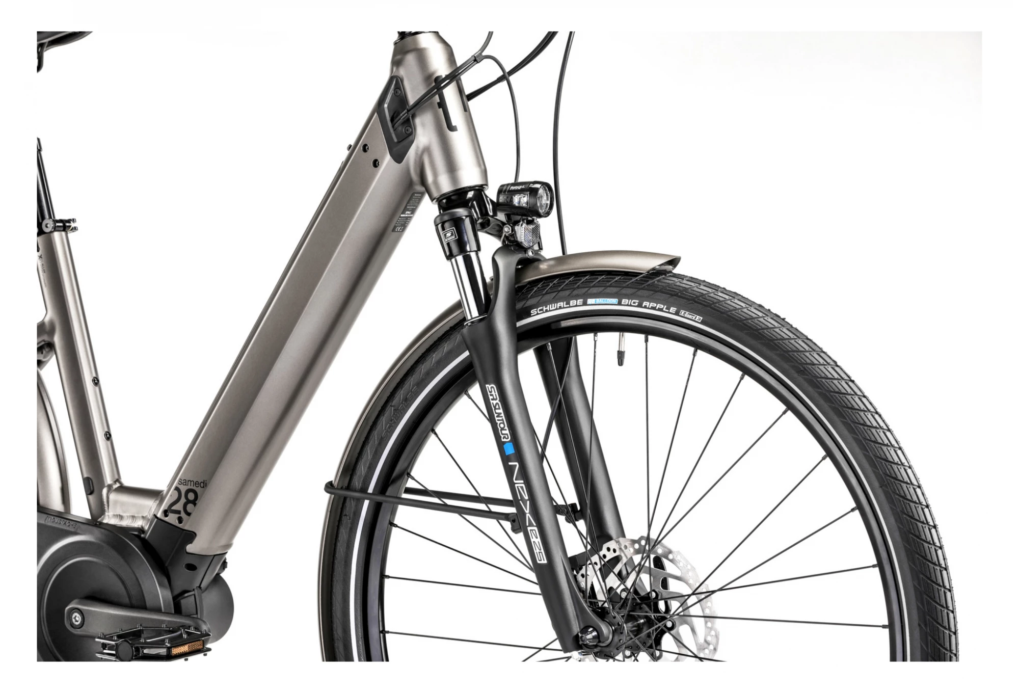 | Cadre | Samedi 28, Aluminium 6061 T4-T6, tubes hydroformés à épaisseur variable, intégration exclusive pour batterie Bosch PowerTube (verticale), passage de gaines intégré |